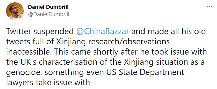 Twitter冻结了@ChinaBazzar账号,导致博主本人以前所有关于新疆研究和观察的推文都无法访问。此前不久,@ChinaBazzar刚对英国将新疆局势描述为“种族灭绝”表达了不满。要知道(所谓“种族灭绝”的)那些论调就连美国国务院的律师都不能苟同。